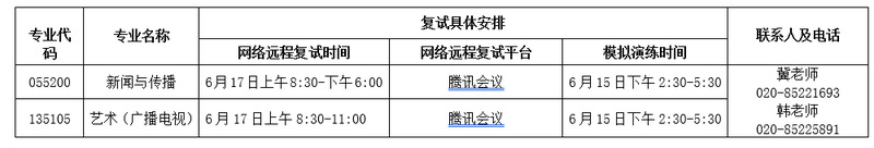 专业代码专业名称复试具体安排联系人及电话网络远程复试时间网络远程复试平台模拟演练时间055200新闻与传播12月28日下午2:30-6:30腾讯会议12月25日上午9:00-12:00冀老师020-85221693韩老师020-85225891135105艺术(广播电视)12月28日下午2:30-6:30腾讯会议12月25日上午9:00-12:00考生须知:1.凡获得复试资格的考生,请务必于2021年12月24日中午17:00前将复试材料发送至邮箱abckaoyan1@163.com,邮件主题统一为“外招考生XXX(姓名)复试材料”。凡提交了复试材料的考生,公司视作已获知复试...
