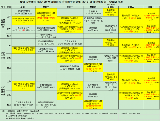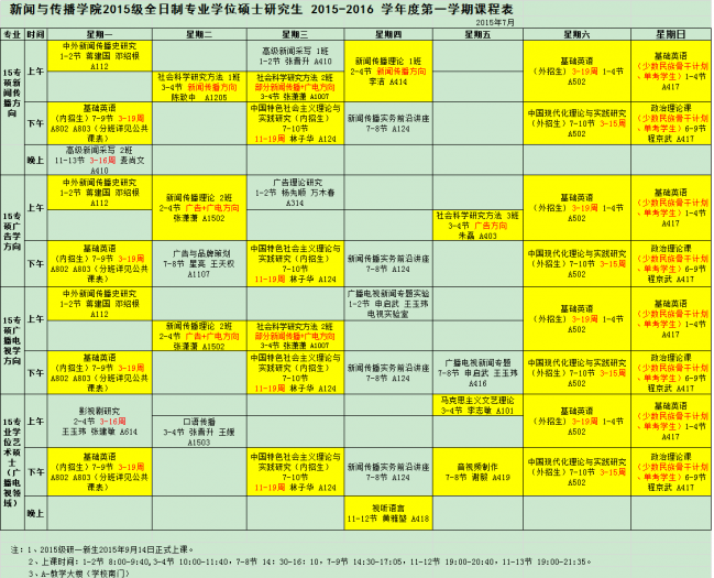 2015级全日制专业学位硕士研究生 2015-2016 学年度第一学期课程表