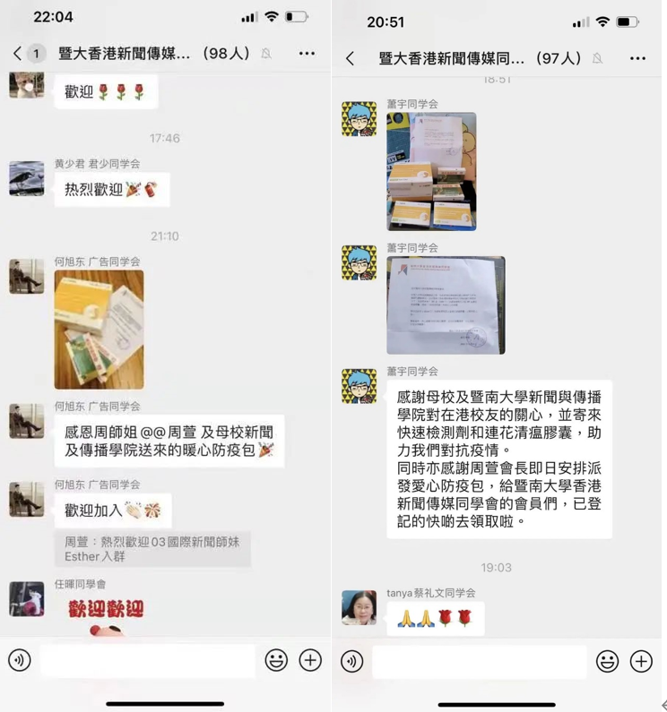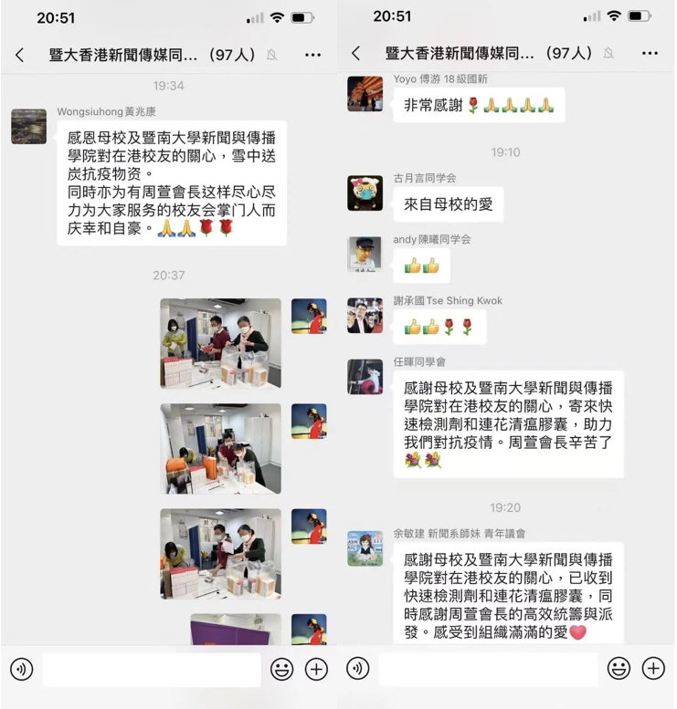领到防疫爱心包的员工、同学也纷纷对暨大香港新闻传媒同学会成员表示感激之情。