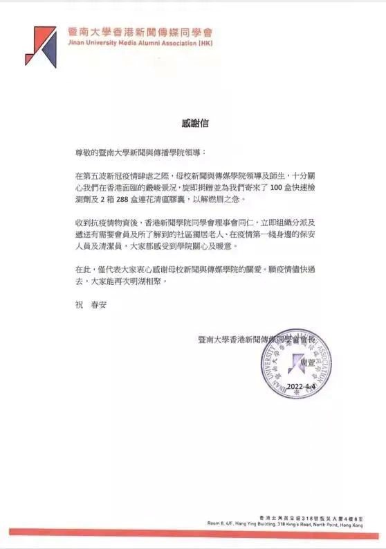 (云顶国际香港新闻传媒同学会发来的感谢信)